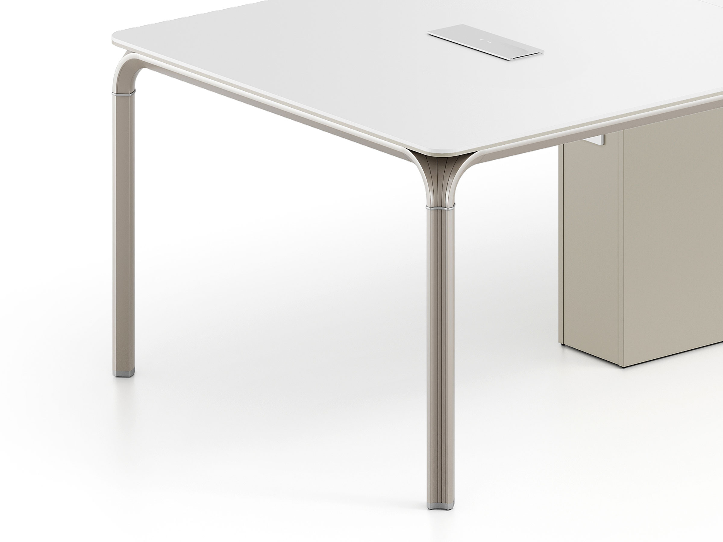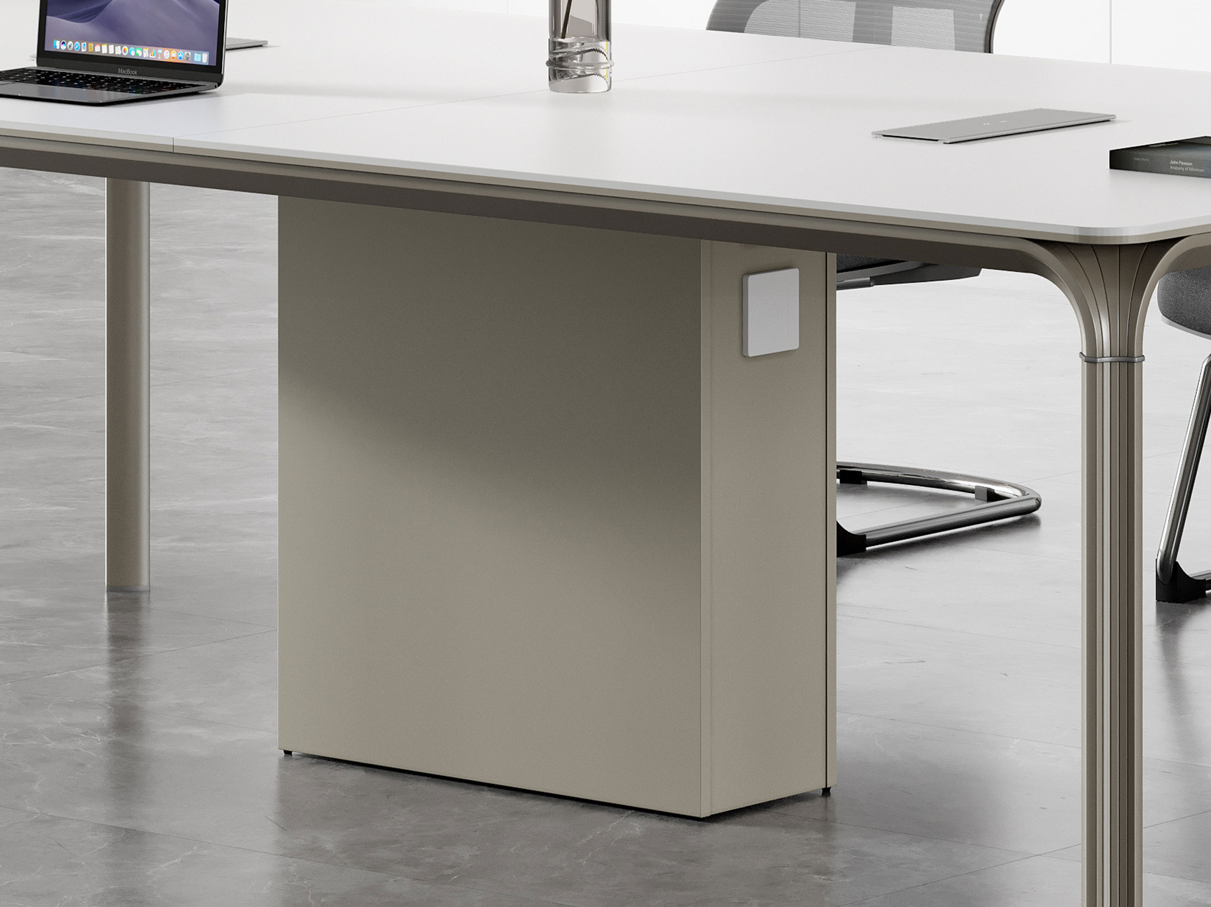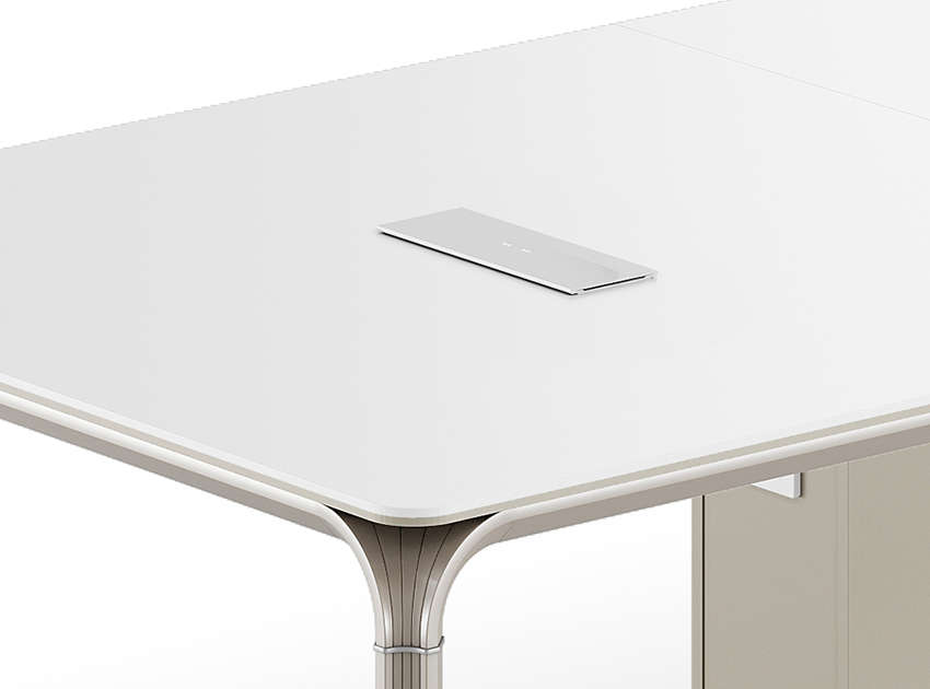 The conference table features a robust support base box, a one-piece molded design for stable load-bearing capacity, and minimalist lines that complement modern meeting spaces. It offers maximum support while maintaining both structural strength and aesthetic appeal.
