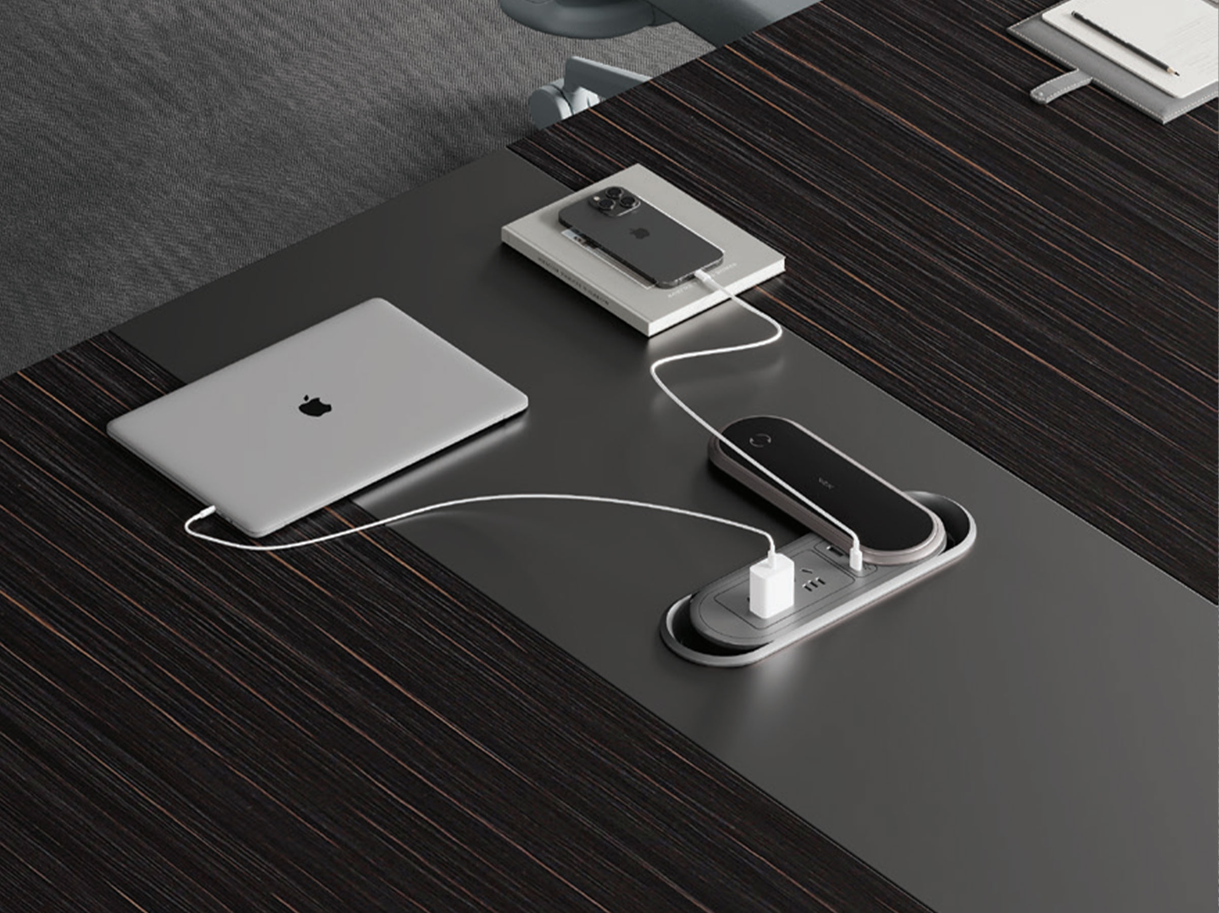 A multimedia rotating cable box featuring a flexible, concealed design that opens and closes with ease. Integrating power outlets and multiple USB ports, it meets the charging needs of computers, mobile phones, and other devices—allowing you to stow cables with a single touch and bid farewell to desktop clutter.